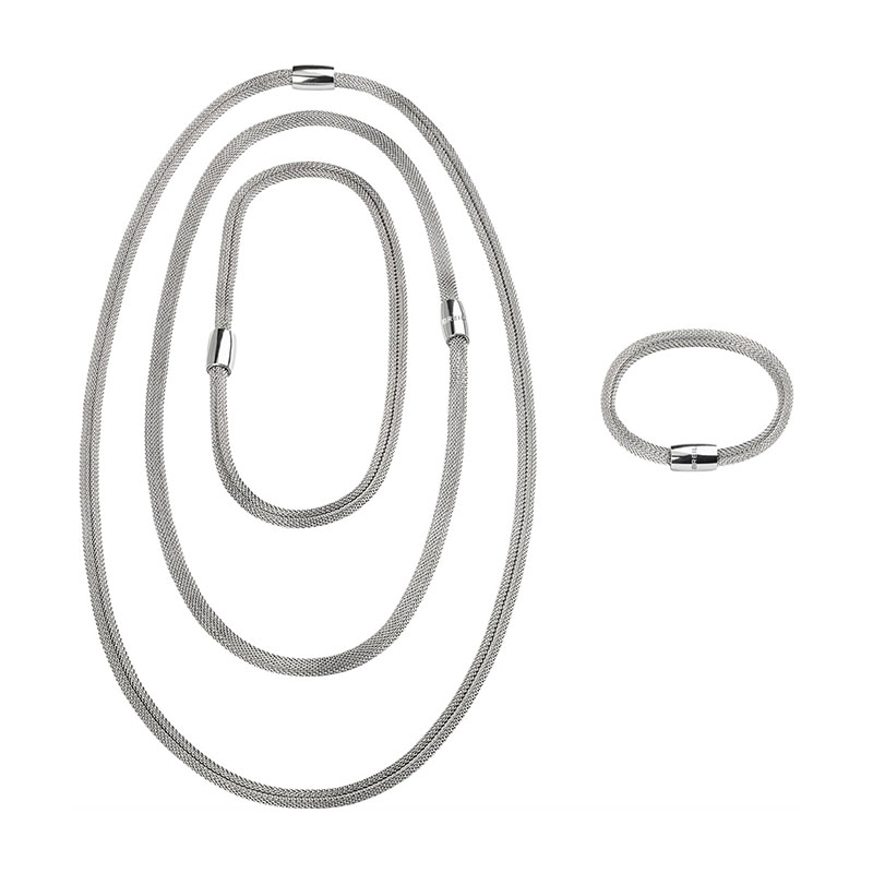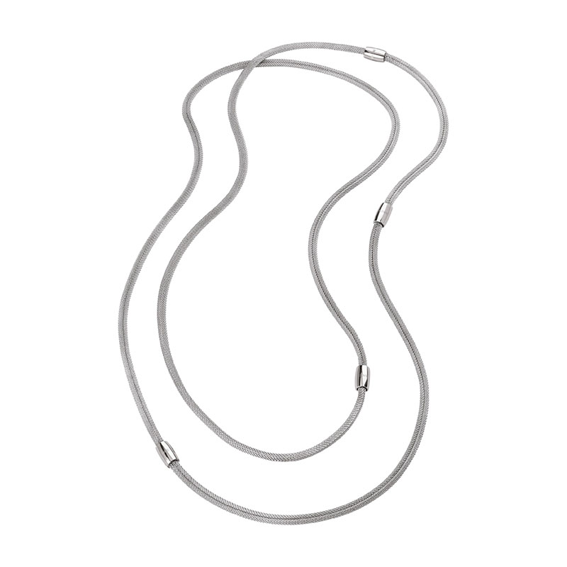 Collana da donna, collezione New Snake Soft, in acciaio. Composta da 4 elementi indossabili insieme o singolarmente, utilizzabili come collana o come bracciale. Chiusure con magnete. Lunghezza elementi: 20cm, 40cm, 60cm, 80cm. Lunghezza totale: 200cm