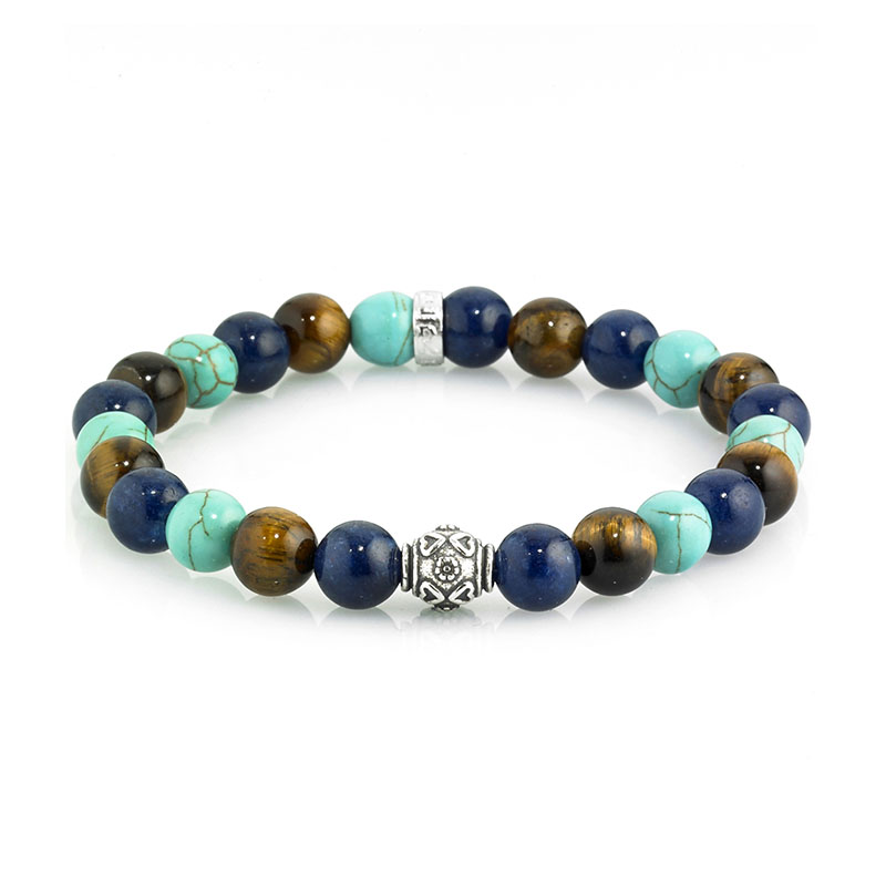 Bracciale da uomo, collezione Stone, modello Colorado. Realizzato in occhio di tigre, agata, diaspro, Argento 925, con componenti logati Gerba. Bracciale di colore blu e marrone con pietre di 8mm. Lunghezza 20 cm. Chiusura Con filo elastico.
