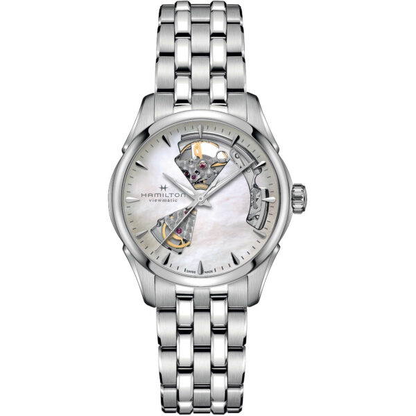 Orologio automatico da donna collezione Jazzmaster, modello Open Heart Lady. Cassa in acciaio diametro 36 mm con apertura sul retro. Quadrante di colore madreperla. Cinturino in acciaio di colore argento con chiusura a farfalla. Vetro zaffiro con trattamento antiriflesso su un lato, Calibro Eta H-10 e riserva di carica di 80h. resistenza all’acqua di 5 Atm e movimento automatico.
