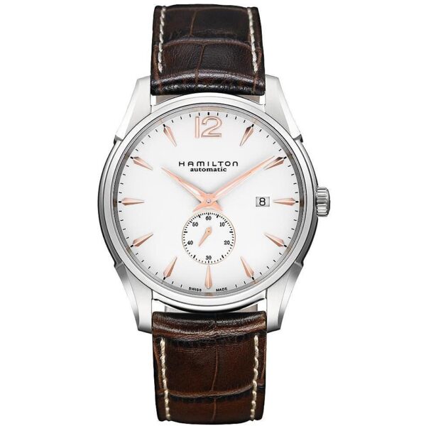 Orologio automatico da uomo collezione Jazzmaster, modello Small Second. Cassa in acciaio diametro 43 mm. Quadrante di colore bianco. Cinturino marrone in pelle di vitello con chiusura ad ardiglione. Vetro zaffiro , Calibro 2895-2 e riserva di carica di 50h. Resistenza all’acqua di 5 Atm e movimento automatico.