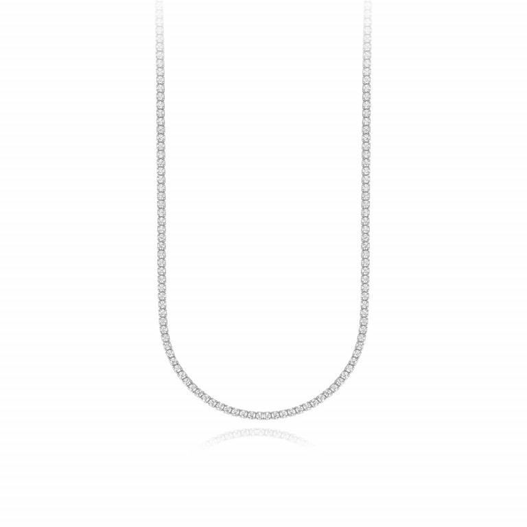 Girocollo tennis in argento con zirconi. Incastonatura degli zirconi a griffe. Diametro degli zirconi: 1,75 mm. Chiusura con moschettone. Misura unica, lunghezza 41 cm.