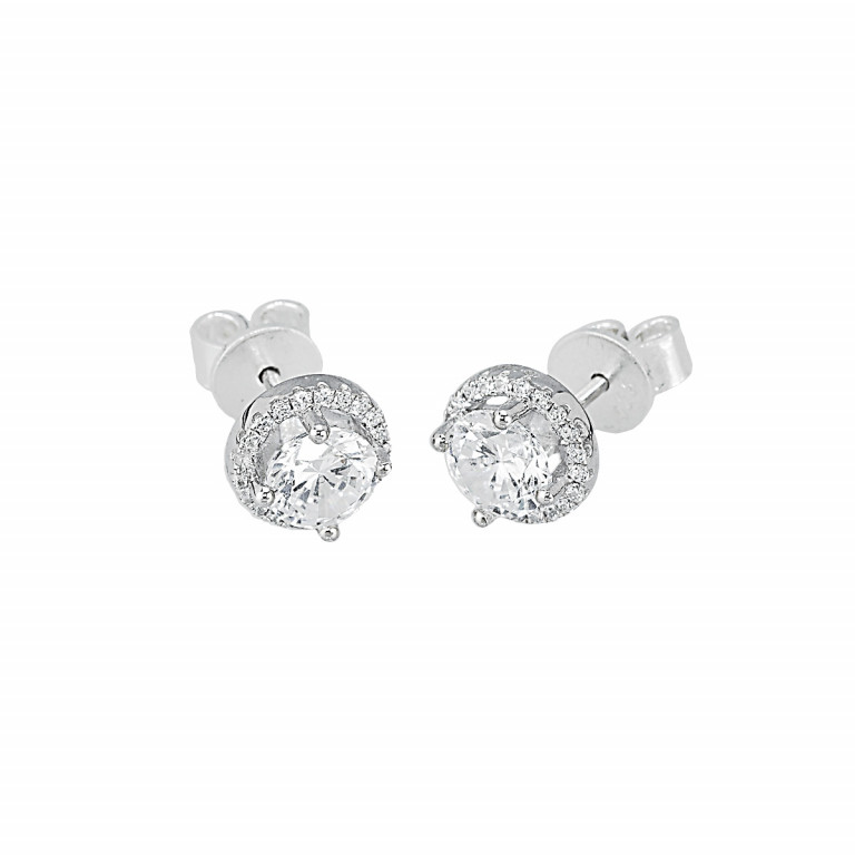 Orecchini al lobo in argento 925 con punti luce in zircone. Incastonatura degli zirconi a griffe a quattro punte. Diametro degli zirconi centrali: 6 mm. Misura unica.