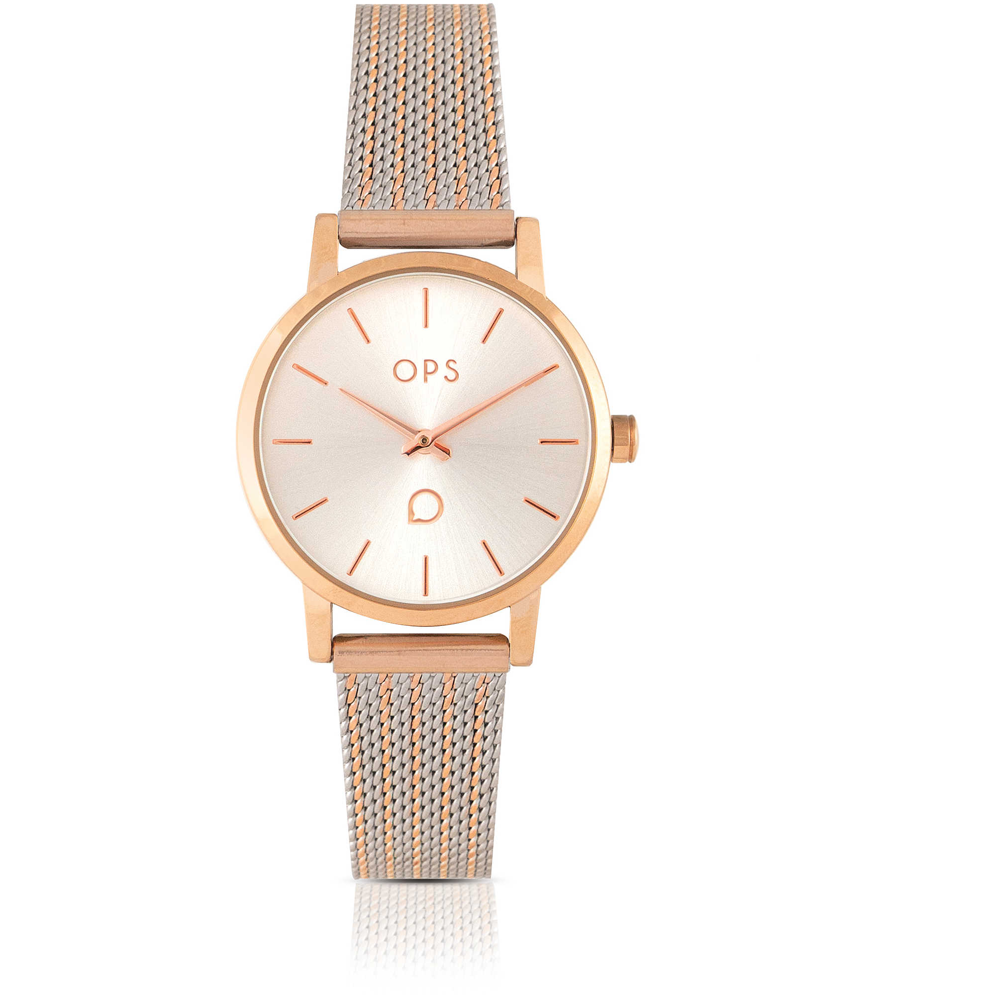Orologio solo tempo da donna, collezione Unconventonal Love. Cassa in metallo color oro rosa, diametro 30 mm. Quadrante sunray rosa con cristalli, logo inciso e bracciale in acciaio color argento e oro rosa. Resistenza all’acqua di 3 Atm.